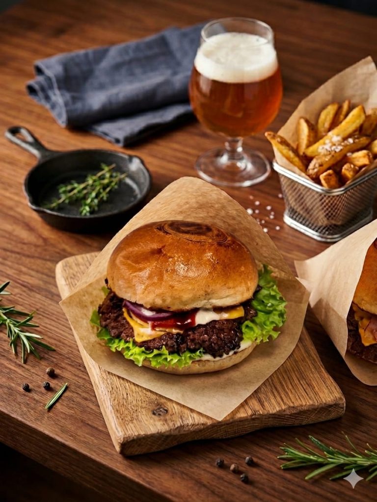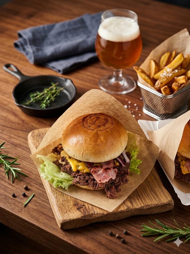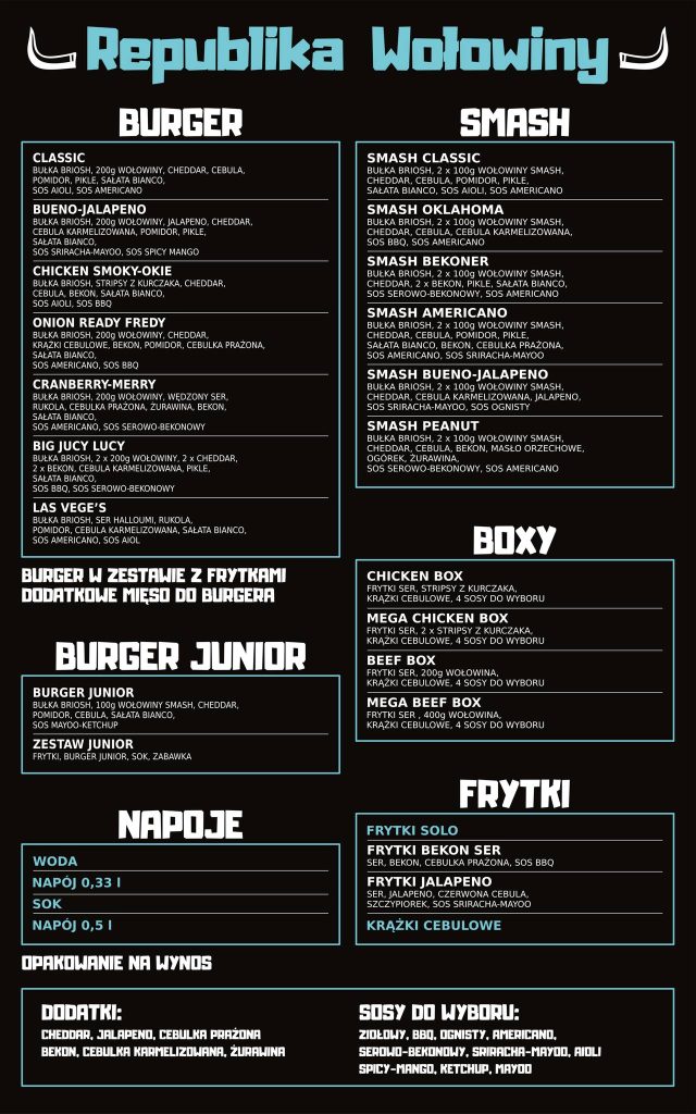 Republika Wołowiny to miejsce stworzone dla prawdziwych fanów solidnych, soczystych burgerów. W menu znajdziesz zarówno klasyczne kompozycje z wysokiej jakości wołowiną, jak i smash burgery z intensywnym smakiem oraz autorskimi sosami. Oprócz tego oferujemy boxy z mięsem i dodatkami, chrupiące frytki oraz opcje dla miłośników kurczaka i wegetariańskich smaków. Stawiamy na świeże składniki, wyraziste połączenia i konkretną porcję, która naprawdę robi robotę.